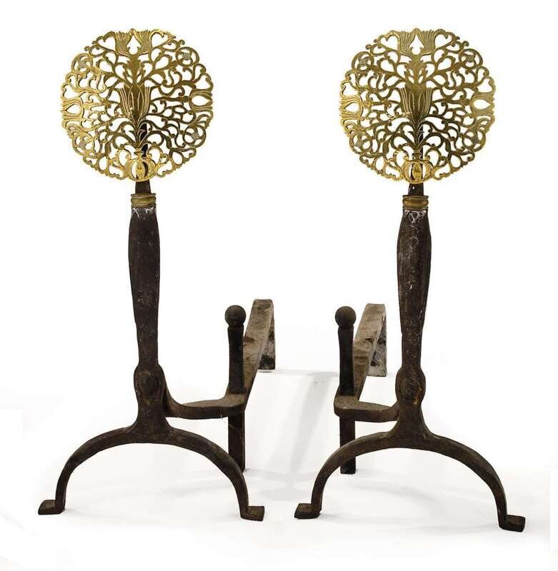 Pair of Continental brass and iron andirons 19th century