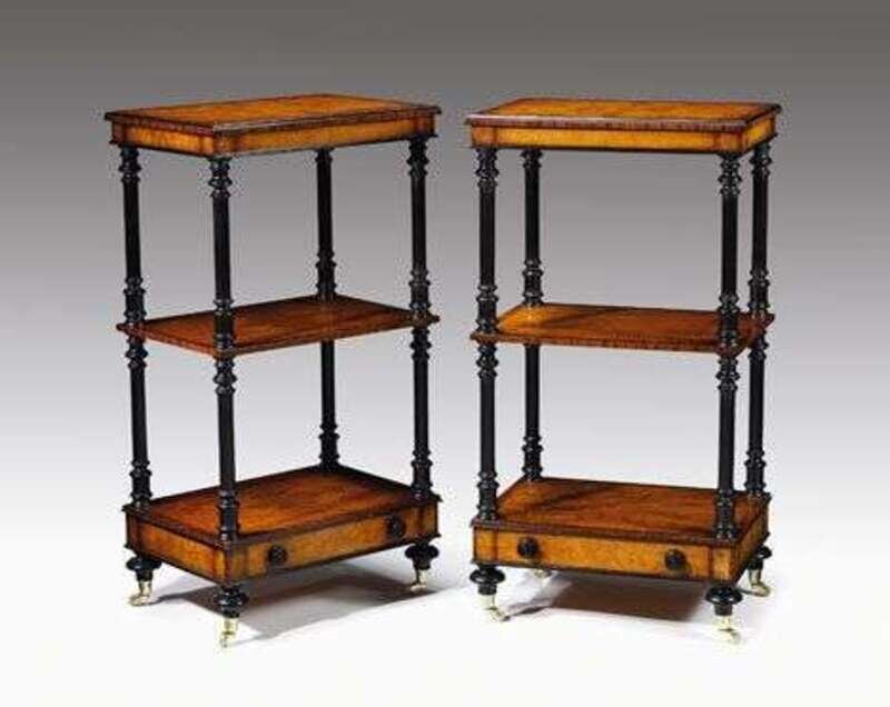 The three tiered shells with turned supports above a single drawer with ebony painted knobs on turned feet with casters.