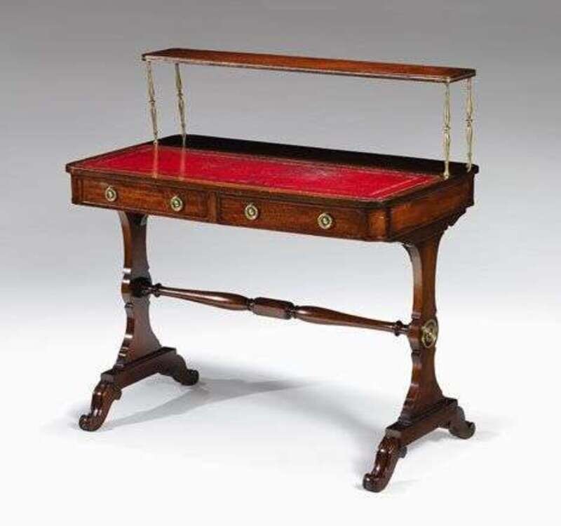 The superstructure on turned brass supports over the red leather inset writing surface, above two side by side drawers, above scrolled trestle supports united by a turned stretcher.