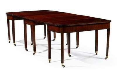 The rounded rectangular end sections opening to accommodate a drop leaf center section; all raised on square tapered legs ending in brass caps and casters.
