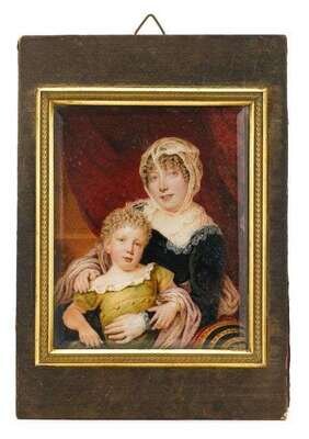 Watercolor on ivory, depicting a seated and smiling young woman with curled blonde hair beneath a lace cap and a dark dress, her arms around her blonde haired child in a yellow dress who rests against her; in a gilt metal and fabric frame; the reverse inscribed and dated Edinburgh, 1817.