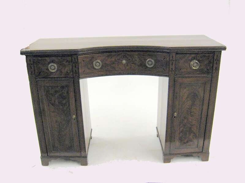 The concave top over the frieze fitted with a central drawer flanked by a short drawer to either side, each pedestal fitted with a cupboard.