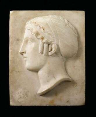 The square marble plaque carved with a profile portrait of a classical young lady.
