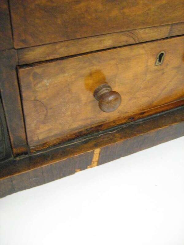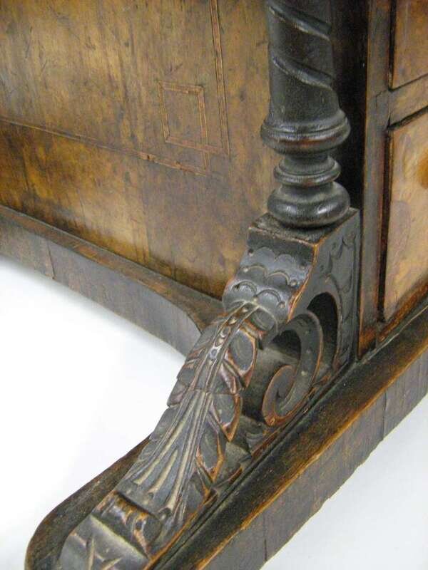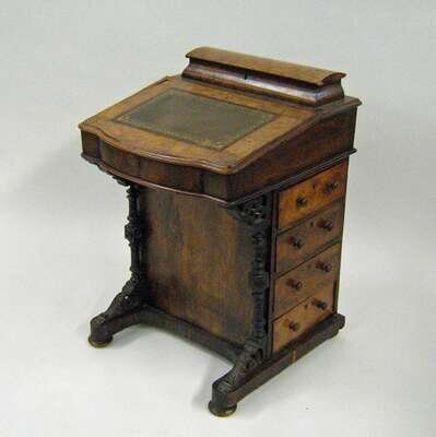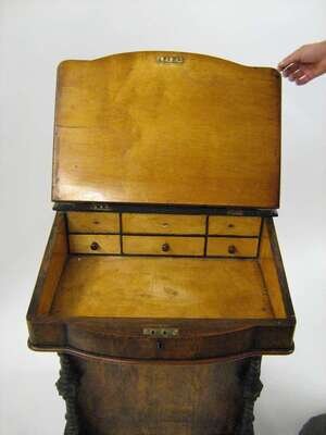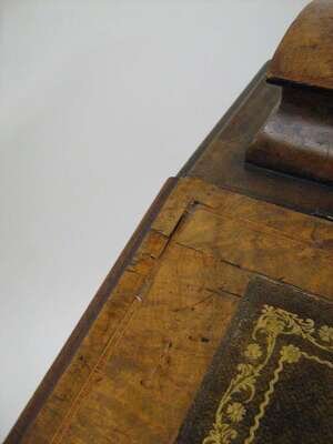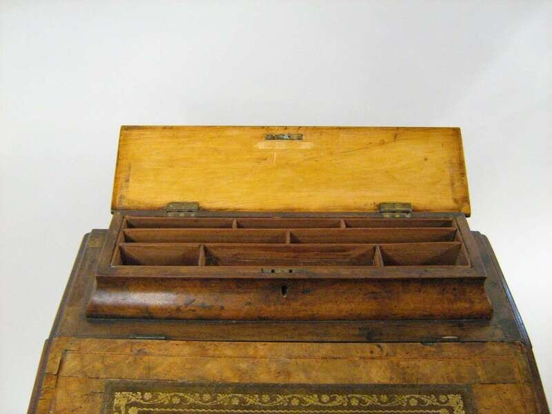 The upper section with a leather inset slant top with a hinged superstructure, opening to reveal a plain maple interior with drawers, on pierced bracket supports; the lower section with a side cupboard door opening to maple drawers, the opposing side with dummy drawers, raised on bun feet.