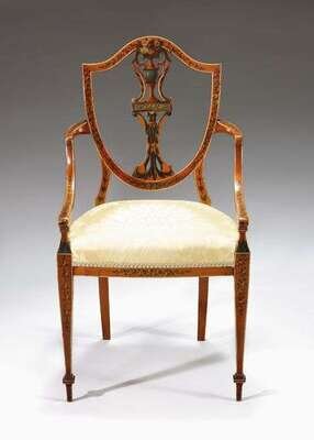 The shield-shaped backrest with a pierced vasiform splat above a padded seat and curved armrests raised on square tapered legs ending in spade feet; the whole painted with flowering garlands and bell flower trails.