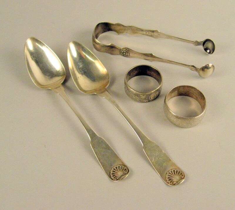 Comprising a pair of serving spoons stamped 'F&Y', a pair of sugar tongs stamped 'T&S' decorated with a flower filled urn, three napkin rings with chased decoration and Chinese characters and a pair of spoons.