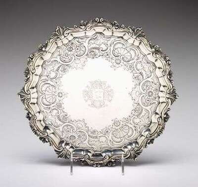 Of piecrust form with a shell and scroll border surrounding engraved decoration of flower heads and C-scrolls and a heraldic crest.