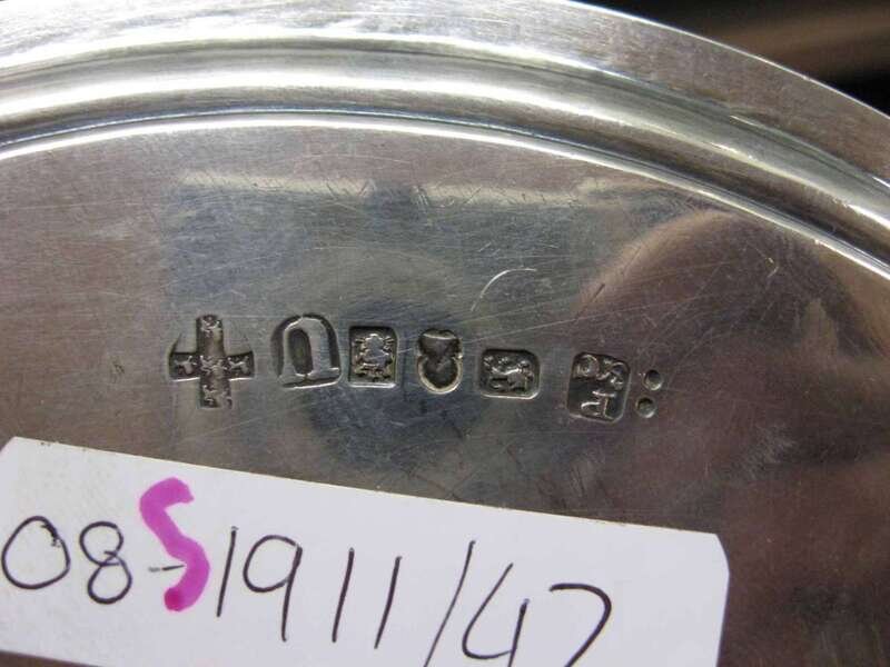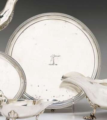 Of circular form with a reeded rim, raised on scrolled feet, engraved with an armorial to the center.