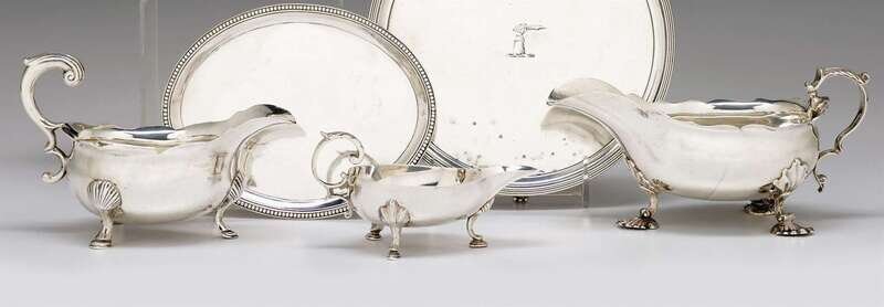 The first example with a barbed rim, double scroll handle and shell cast feet, monogrammed 'W.S.H.' and dated London, 1748, maker's mark rubbed; a smaller example of similar form with an upright scroll handle and pad feet, possibly James Jones, London 1753; and a small plain example with an open scroll handle and pad feet, dated London, 1762, maker's mark rubbed. (3).