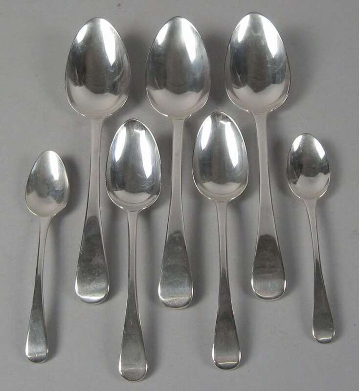 Comprising 11 marked William Eley & William Fearn, 1816; 6 marked Jonathan Hayne, 1828; 4 marked Henry Hobdell, 1781; 4 marked Thomas & George Hayter, 1826; 3 marked James Wintle, 1827; 1 marked Thomas Streetin, 1823; 2 marked 'HS', 1 marked 'IH'; and two with maker's marks rubbed. (34).