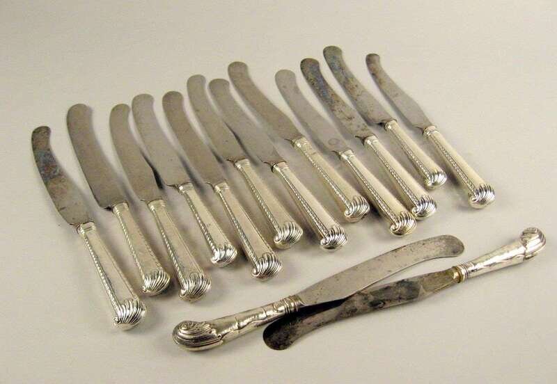 Comprising 5 by Robert Trickett & Co., Sheffield, 3 with maker's mark JH and 3 with maker's marks rubbed; together with 2 silver plate handled knives stamped 'IL', each with a pistol girp and reeded edge.(14).