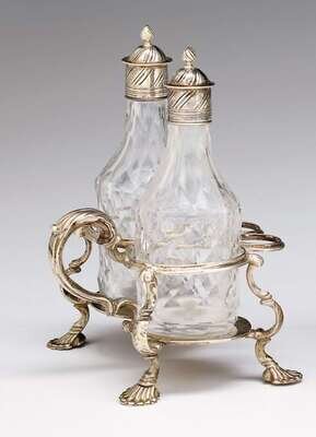 George II sterling silver two bottle cruet stand samuel wood, london, 1759
