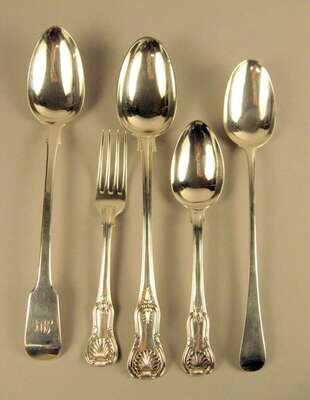 Comprising a stuffing spoon, serving spoon, and a dinner fork; together with two Georgian sterling silver stuffing spoons, Jonathan Hayne, London 1827 and William Fearn, London 1792. (5).
