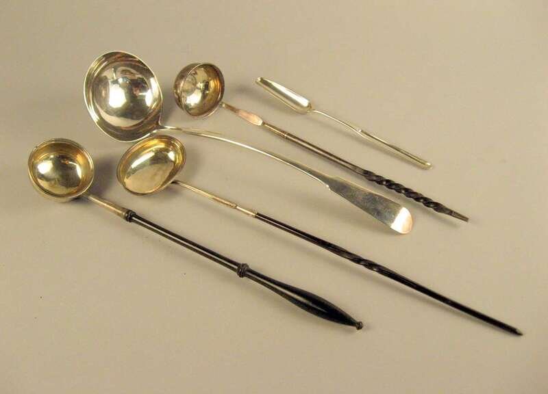 Comprising a soup ladle by Alexander Henderson, Edinburgh, 1807; a toddy ladle with marks rubbed, possibly by Elizabeth Morley, London, 1802; a toddy ladle with maker's marks rubbed; stuffing spoon by Thomas Northcote, London, 1785 and a marrow scoop with maker's mark 'IB', London, 1800; together with a toddy ladle stamped 'L&R" and 'T*T'. (6).
