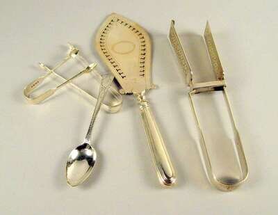 Comprising bread tongs by William Knight, London, 1825; sugar tongs by Samuel Godbehere & Edward Wigan, London, 1789; fish server by Peter & Ann Bateman, London, 1795 with a pierced blade; sugar tongs by Mary Chawner, London, 1839; meat skewer by Thomas Watson, Newcastle and a desert spoon by Samuel Wintle, London, 1784 with bright cut decoration. (5).