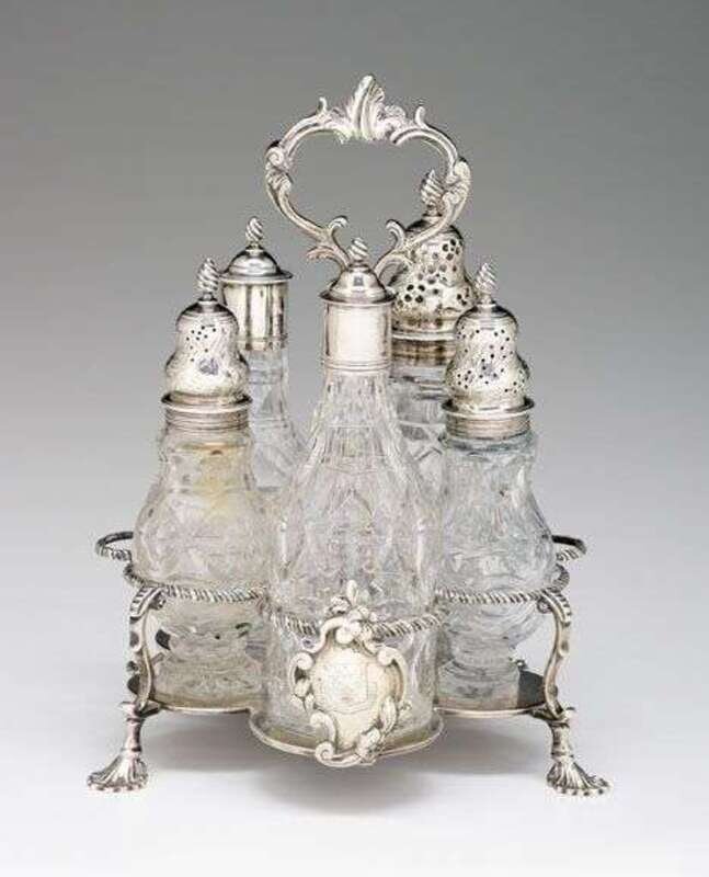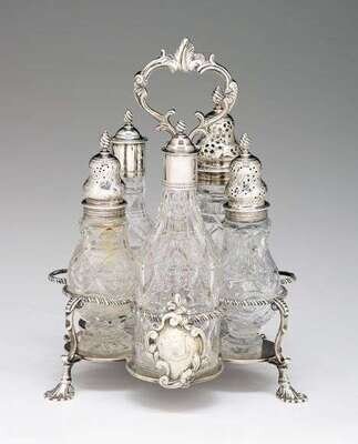 George III sterling silver five bottle cruet stand jabez daniel & james mince, london, 1769