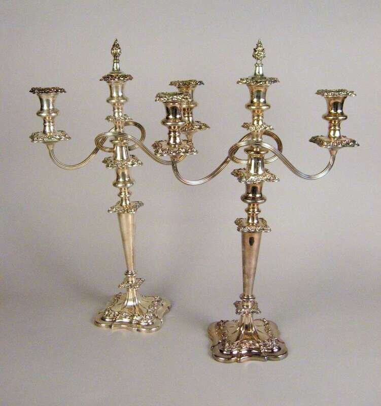 Pair of Sheffield silver plated three light candelabra