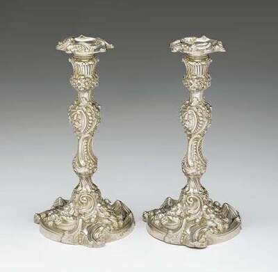 Pair of George IV Rococo Revival sterling silver candlesticks waterhouse, hodson & co., sheffield, 1829
