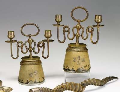 Each hoof with brass mountings modeled as horse's hair and applied with brass Chinese characters, stag and boar's head, supporting a brass scrolling two light candelabra with central loop handle, the whole mounted to a horse shoe base. (2).