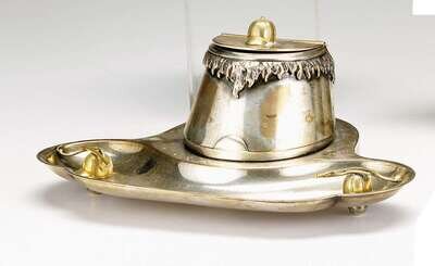 Modeled as a horse's hoof, with applied brass riding helmet and crop decoration, with attached pen tray with engraved geometric decoration.