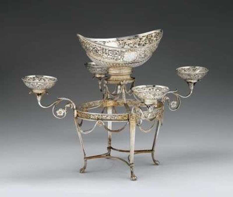 The central pierced boat-shaped basket centered by a cartouche engraved with an heraldic shield, raised on four curved supports with drapery swags and foliate caps, above a floral pierced oval gallery hung with further drapery swags and issuing four scrolling arms, each supporting a circular pierced dish, raised on four reeded legs ending on paw feet and united by incurved stretchers.