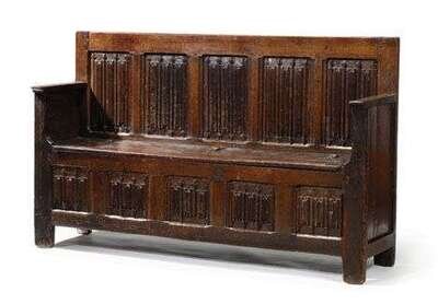 The rectangular backrest with linenfold carving above enclosed plank armrests and a hinged seat above an enclosed base carved to match.