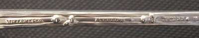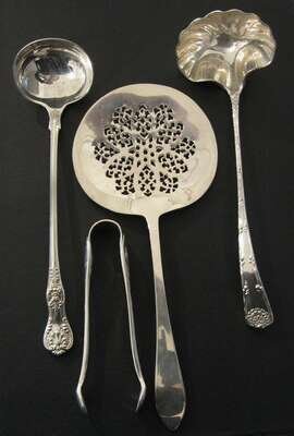 Comprising a 'Wave Edge' pattern gravy ladle, an 'English King' pattern gravy ladle, a 'Faneuil' pattern vegetable server and a pair of 'Audubon or Japanese' pattern sugar tongs. (4).