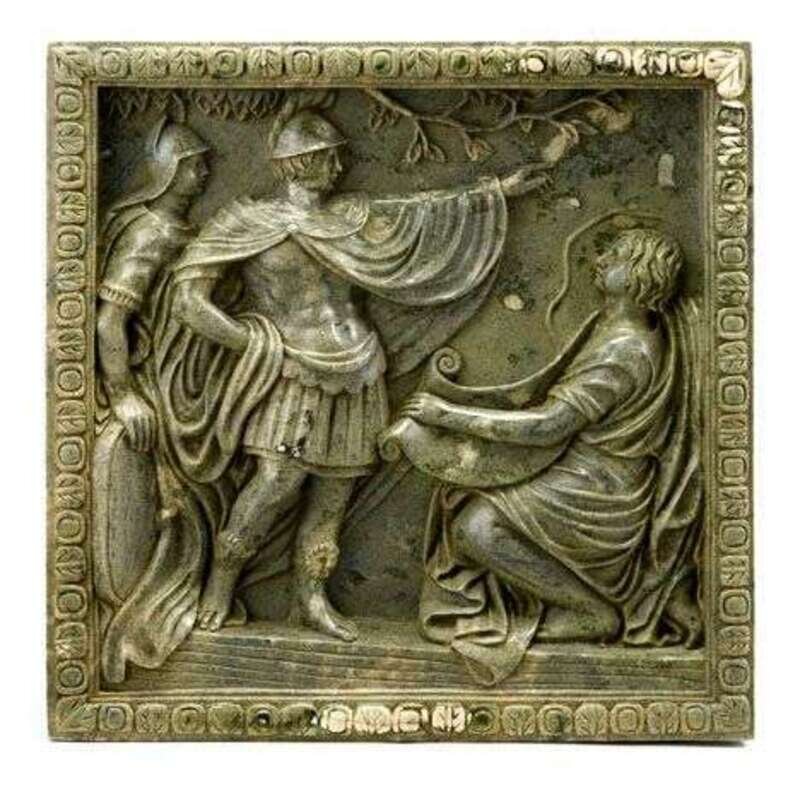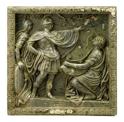 The square panel carved in relief with a classical scene of soldiers within a molded border.