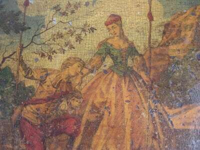 Painted pine, each of rectangular shape and painted with a reserve depicting courting couples on a red ground, with additional reserves with flower bouquets to the sides,.