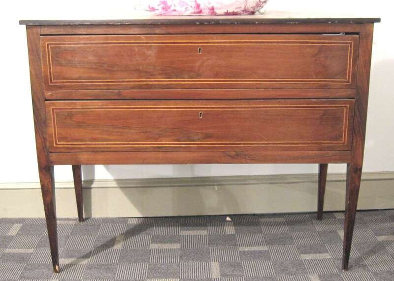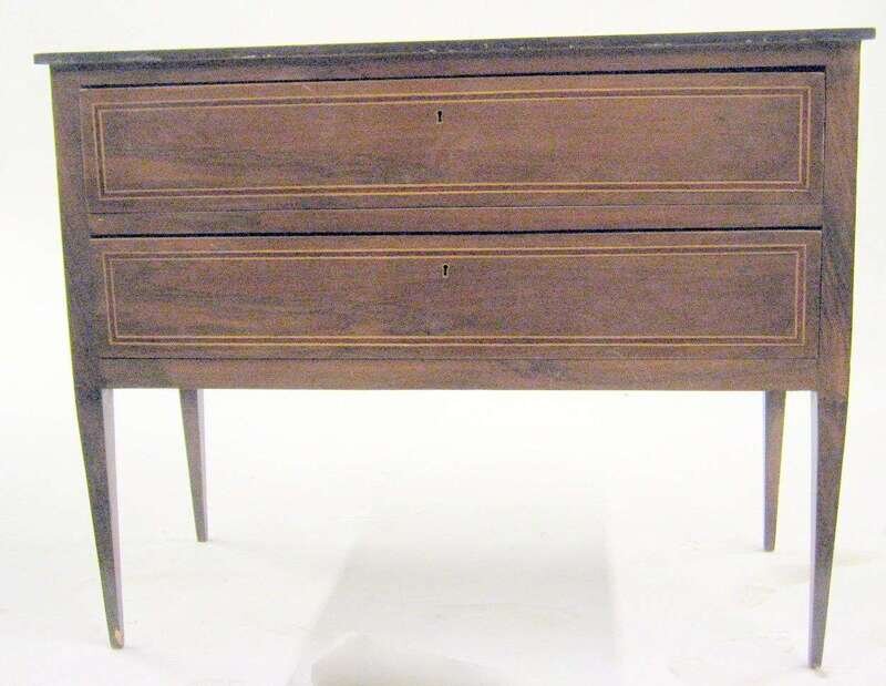 The rectangular top with string inlay and cross banding over two long drawers on straight tapered legs.
