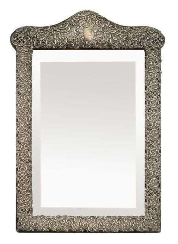 The rectangular beveled mirror plate set in a pierced frame of C-scrolls and trellis, centered by a vacant cartouche, on a green velvet backing with hinged support, apparently unmarked.