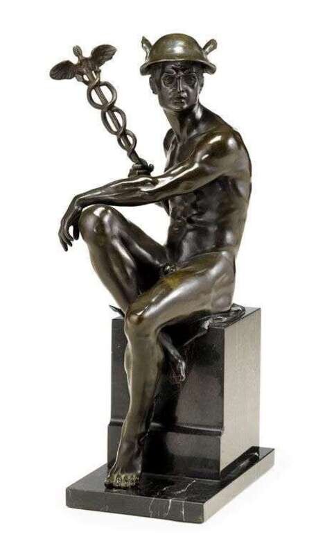 Bronze, medium brown patina, modeled as a nude classical figure of Mercury seated on a stepped black marble base, inscribed 'F. Iffland'.