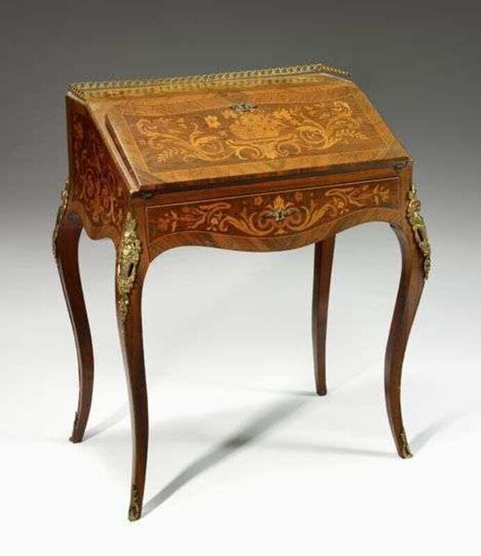 The pierced brass gallery over a floral and foliate inlay hinged top opening to three side by side drawers and a velvet writing surface over a frieze drawer on putti gilt mounted cabriole legs and sabot.
