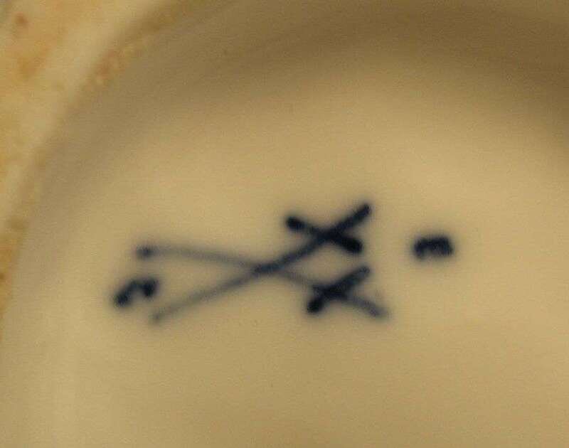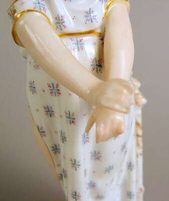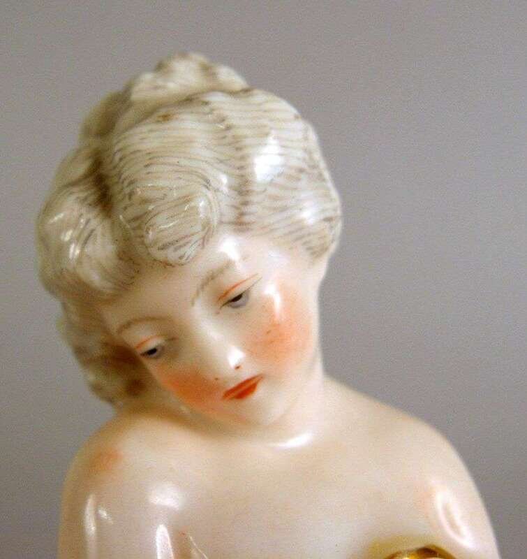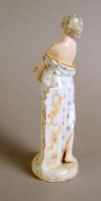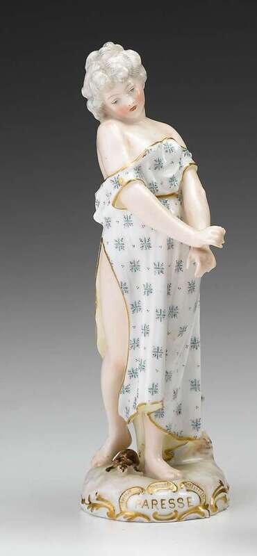 Modeled as a standing figure, her gown slipping off her shoulders, a turtle at her feet, inscribed in gilt on the base, underglaze blue crossed swords mark.