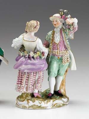 Modeled as a gallant and companion, each holding a floral garland, underglaze blue crossed swords and asterisk mark.