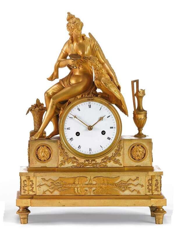 Modeled with the seated figure of Hebe offering a cup to Zeus in the form of an eagle, the white enamel Roman numeral dial with two winding aperatures and flanked by classical mask roundels, the base applied with classical motifs, raised on toupie feet.