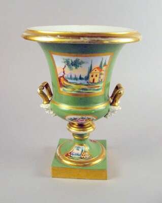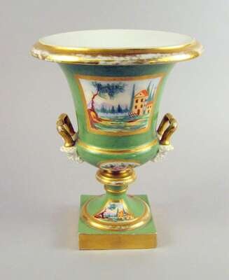 Campana form, the front and reverse painted with landscape reserves against an apple green ground, the gilt loop handles terminating in classical masks.