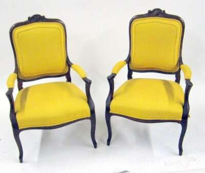 Each with a foliate carved toprail and padded backrest with downswept padded armrests above a padded seat raised on cabriole legs. (2).