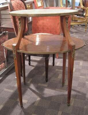 The oval marble top over outswept supports with gilt metal mounts over geometric marquetry shelf on straight tapering legs.