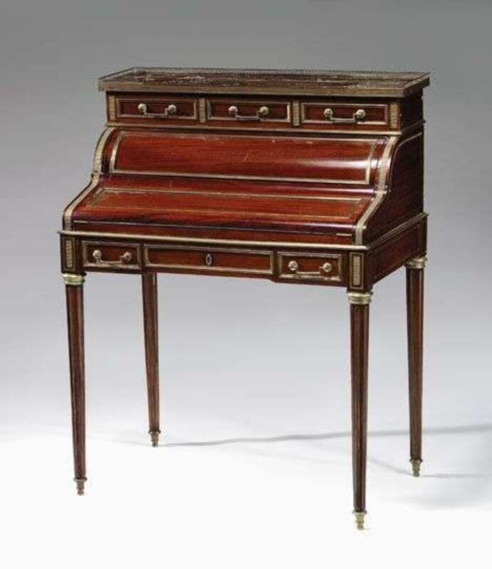 The red marble top with a three quarter gallery over three false short drawers and a roll top opening to reveal three small drawers and a drop down leather writing surface over one long drawer and raised on round fluted legs ending in brass caps; the whole outlined in brass; brass plaque 'Drew's Antiques/ Nebraska' inside the lower draw.