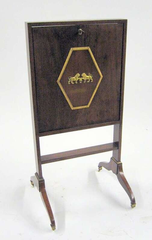 The hinged top unlocks to reveal a leather top surface over cabriole legs.