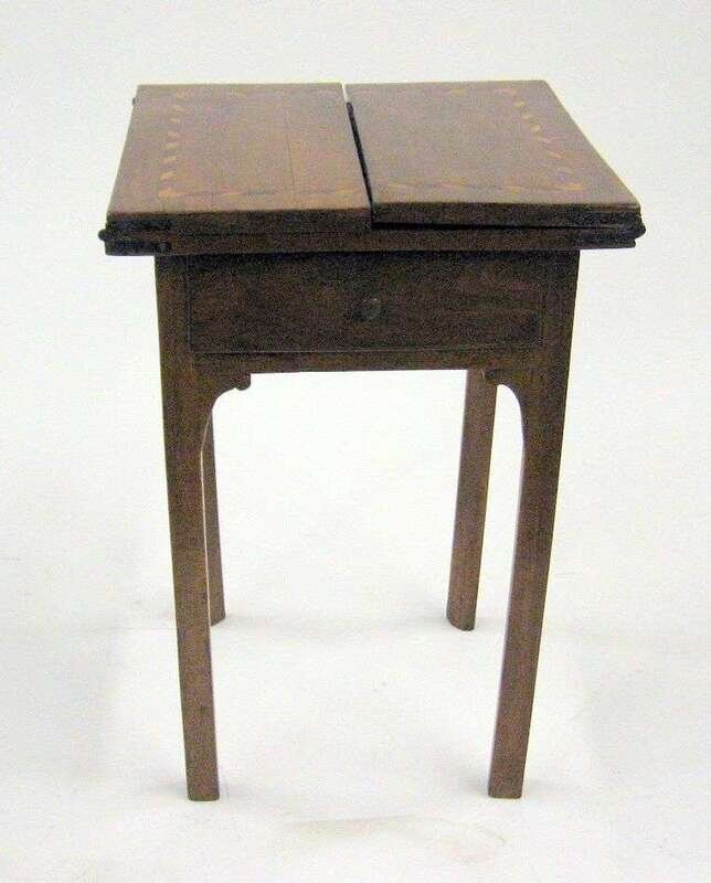 The square hinged top inlaid with banded decoration opening to a leather lined writing surface raised on square legs.