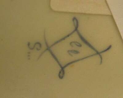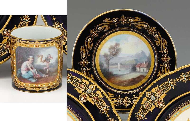 The cup with a painted reserve depicting a maiden and cherub in a landscape on a cobalt ground with gilt details and red and white 'jewels'; the matching saucer with a reserve depicting a harbor scene. (2).