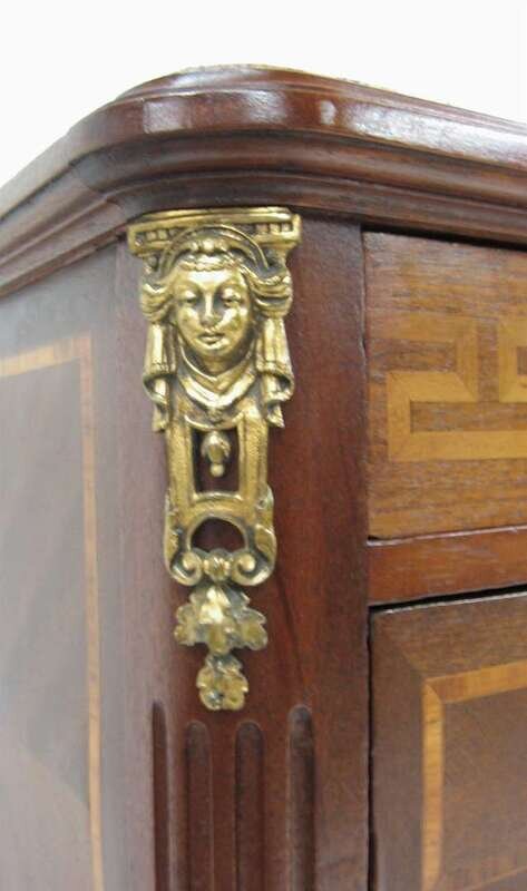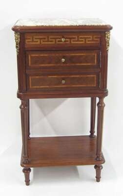 Louis XVI style mahogany, marquetry and gilt bronze mounted bedside table