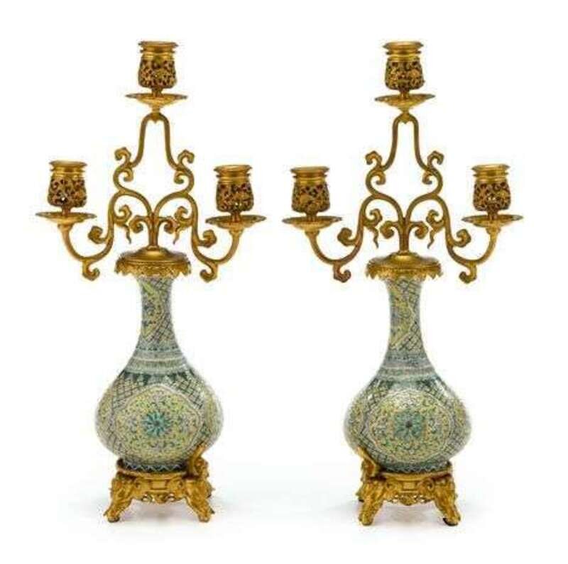 The bottle vases in green and yellow enamel, mounted with Chinoiserie gilt bronze mounts issuing three scrolled arms with pierced foliate candle nozzles and raised on gilt bronze elephants' head feet. (2).