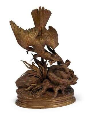 Bronze, red-brown and gold patinas, modeled as a bird returning to feed two chicks in a nest, signed 'J. Moigniez'.