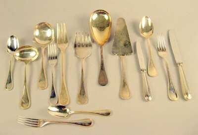 Comprising 20 dinner forks, 20 dinner knives, 24 salad forks, 20 salad knives, 20 tablespoons, 20 dessert spoons, 20 teaspoons, 12 fish forks, 12 fish knives, 2 serving forks, 3 serving spoons, a cake slice.