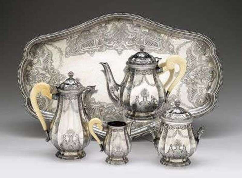 In the Regence style, comprising a coffeepot, teapot, covered sugar bowl and creamer and tray, all pyriform with engraved and chased decoration and surmounted by bud finials, with carved ivory scroll handles.