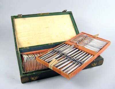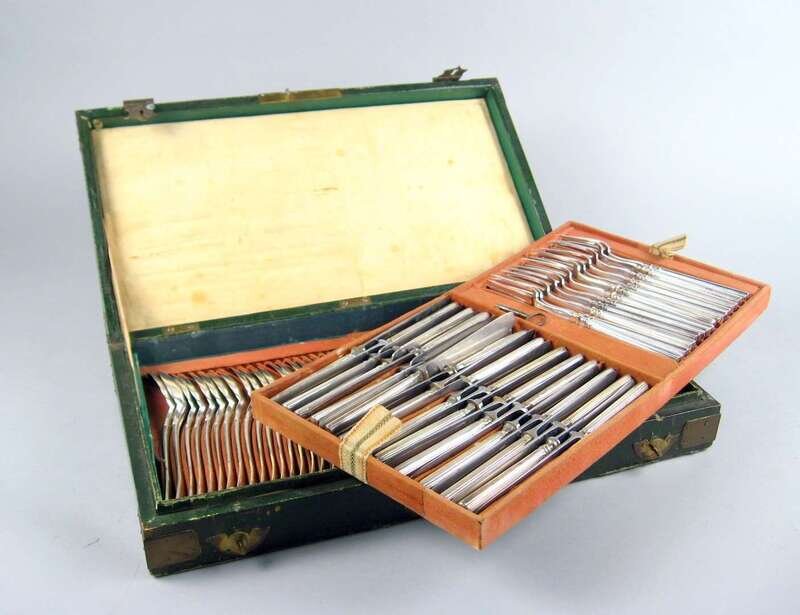 Comprising 24 forks, 24 knives and 24 spoons each with squared handles; in a fitted case. (74).