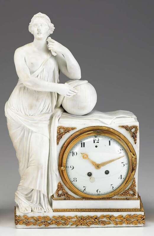 The classical female figure emblematic of Geography standing beside a globe, the white enamel clock face with Arabic numerals with a gilt bezel and wreath spandrels, raised on a plinth base mounted with entwined garlands.